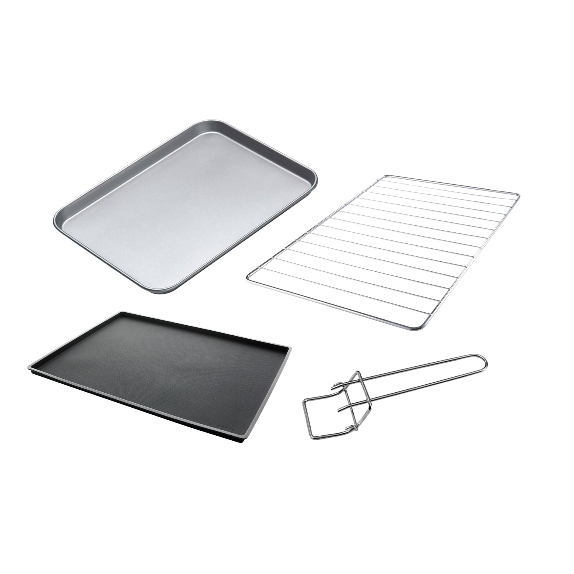 Los accesorios que encontrará dentro del horno son: Rejilla para usar como parrilla, Manubrio metálico para retirar bandeja o rejilla de parrilla, Bandeja metálica.