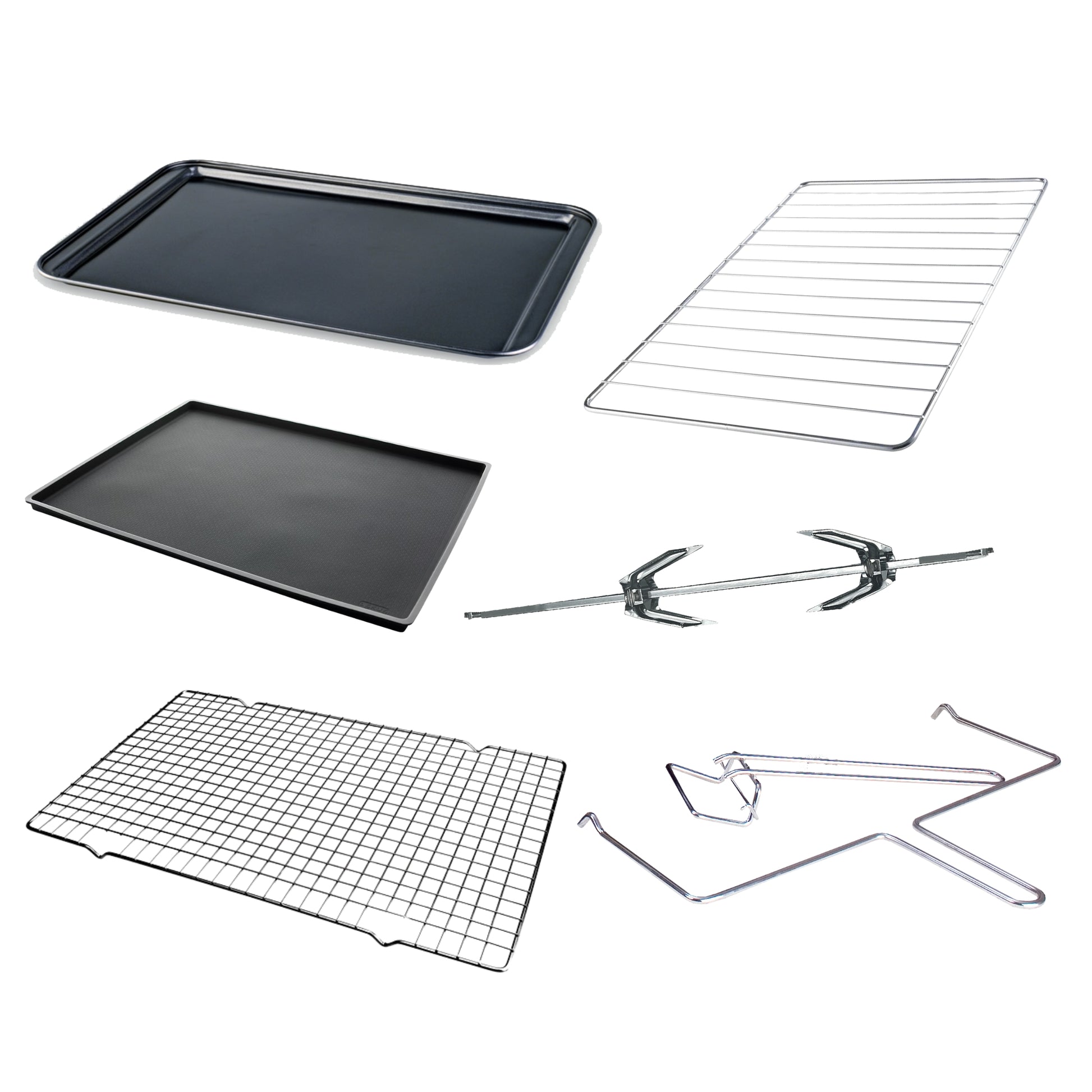 - Los accesorios que encontrará dentro del horno son: Canastilla para rostizar,manubrio para retirar la canastilla,bandeja de hornear, manubrio atrapa bandeja,parrilla para asar,barra con trinches para rostizado,bandeja de residuos.